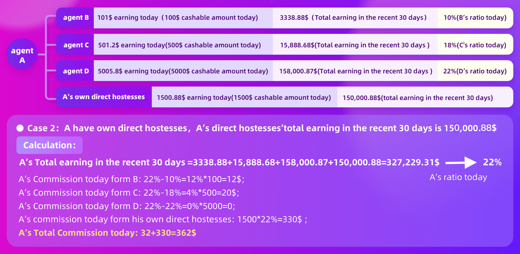 Tu porcentaje de comisión se determina según las ganancias totales de tu equipo durante los últimos 30 días. Los nuevos agentes se evalúan en función de su rendimiento desde el momento del registro.